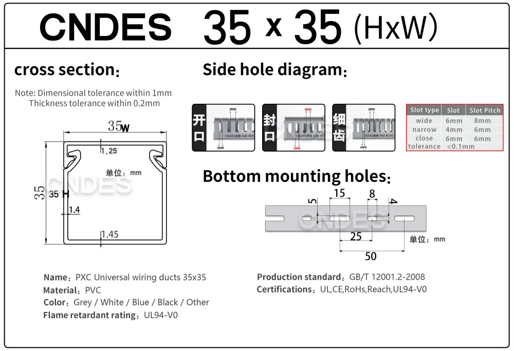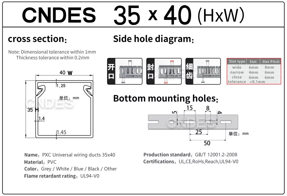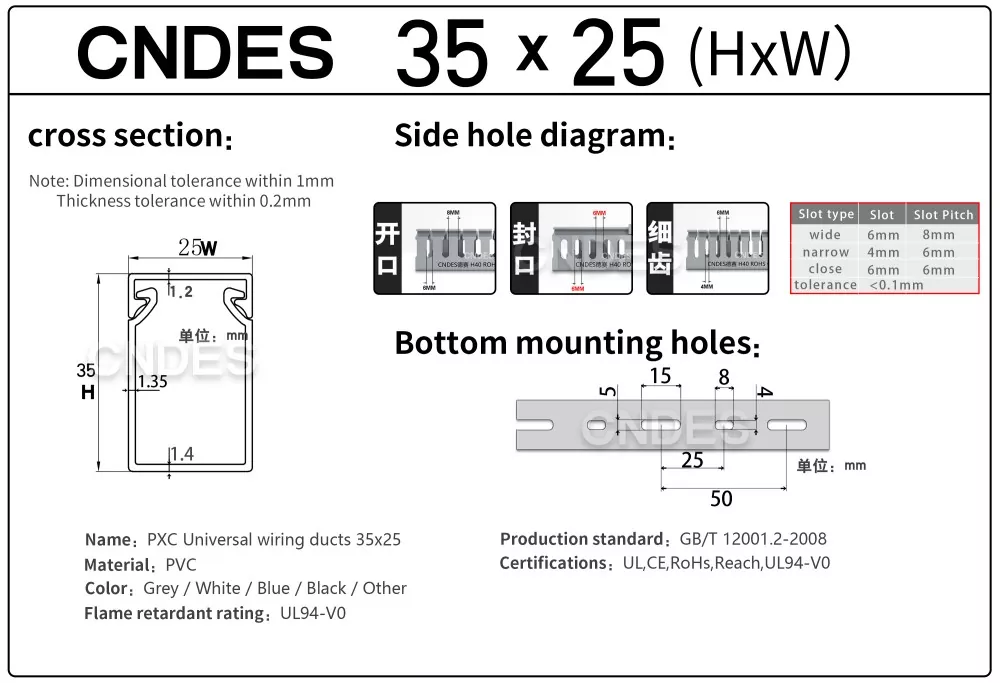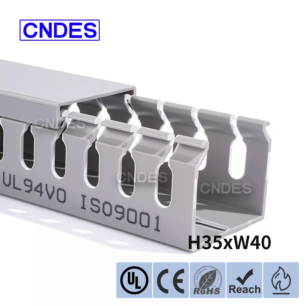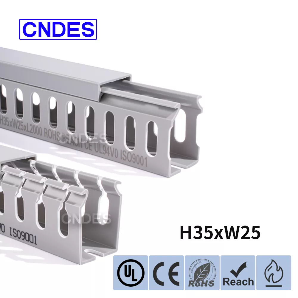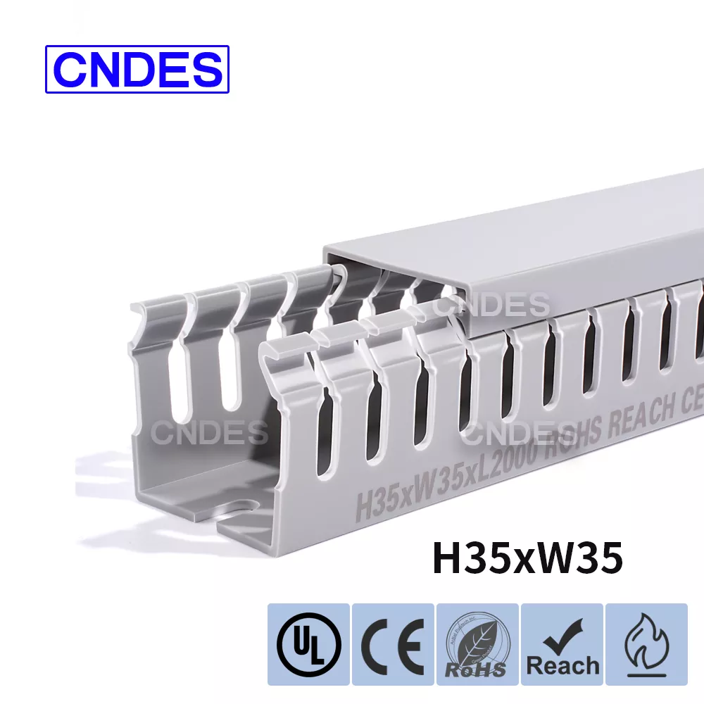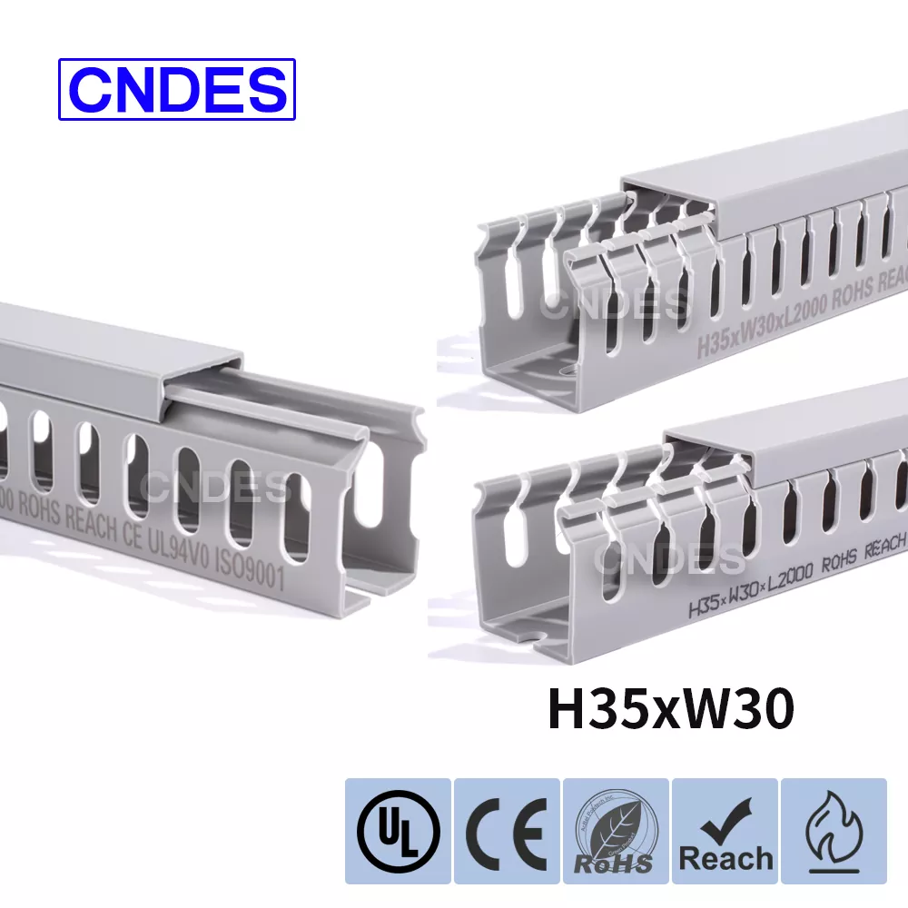 Dostosowany kanał do prowadzenia drutu PCV ze szczeliną o wysokości 35 mm, wyprodukowany przez chińską firmę CNDES, składa się ze sztywnej podstawy z PCV i zdejmowanej pokrywy. Podstawa posiada równomiernie rozmieszczone, przypominające palce rowki wytłoczone po obu stronach, tworząc „zęby grzebieniowe”. Zęby te można złamać ręcznie, umożliwiając drutowi wyjście poziome z dowolnej pozycji. Pokrywę łatwo zatrzaskuje się z powrotem na swoim miejscu, zachowując schludny wygląd. Rząd otworów montażowych na spodzie jest zgodny z rozstawem zgodnym z normą DIN 43659. Można go szybko przymocować do paneli, ram szafek lub podobnych konstrukcji za pomocą śrub lub nitów M5.