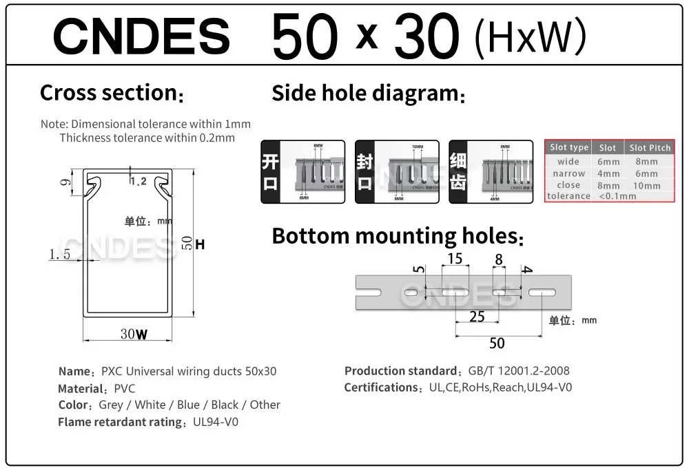 Wysokiej jakości kanał do organizacji kabli ze szczeliną 50 × 30 z PVC firmy CNDES to kompaktowe, wydajne rozwiązanie do zarządzania kablami w ciasnych przestrzeniach, takich jak małe szafy sterownicze, obudowy danych i skrzynki przyłączeniowe sprzętu. Ten wąski kanał kablowy pozwala instalatorom organizować, oddzielać i chronić kable bez zajmowania nadmiernej przestrzeni w panelu.