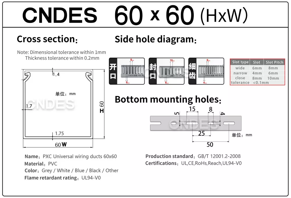 Kanał kablowy szafy sterowniczej CNDES jest wykonany z zastrzeżonej formuły PVC. Szczelinowy kanał szafy sterowniczej z PCV jest przyjazny dla środowiska, trudnopalny i odporny na uderzenia oraz może wytrzymać wielokrotne zginanie o 180° bez pękania.