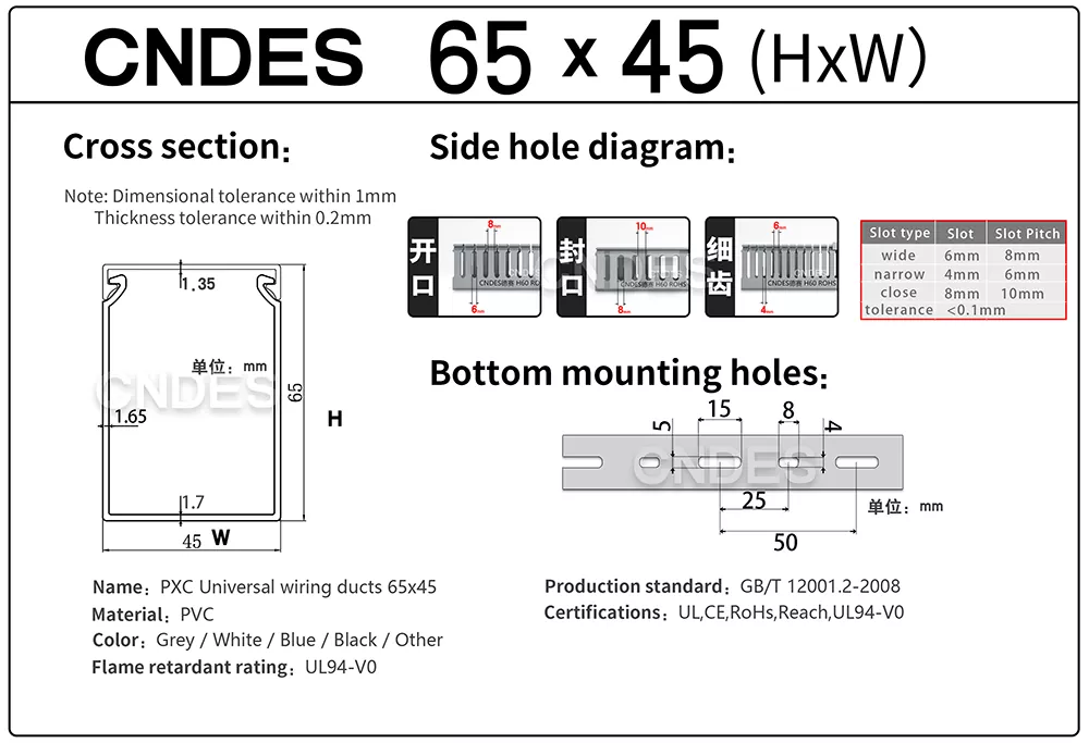 CNDES oferuje hurtowo szare szczelinowe kanały kablowe z PVC 65 × 45 bezpośrednio od producenta. Dostępne w długościach do 2 metrów, cięte lub łączone w zależności od potrzeb. Szary (standardowy kolor RAL 7030) dobrze komponuje się ze środowiskami przemysłowymi; niektóre produkty oferują również kolor biały, czarny i inne. Szare korytka kablowe z PCV z otworami umożliwiają grawerowanie laserowe lub etykietowanie, co ułatwia sortowanie i zarządzanie kablami.