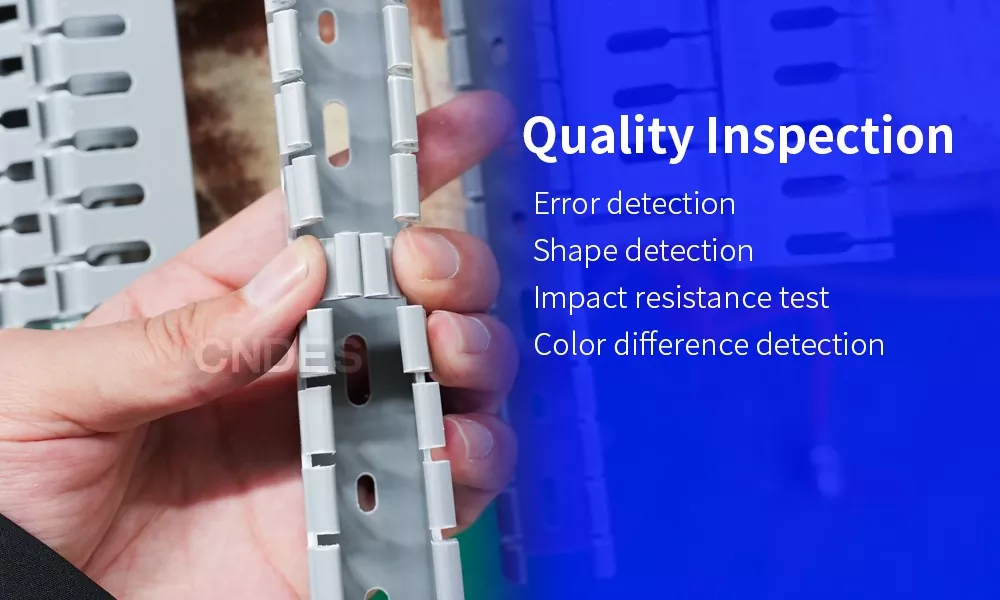 Kontrola jakości na wysokim poziomie jest niezbędna do zapewnienia dobrych produktów. W CNDES nasze dążenie do jakości nie ma końca. Dokładamy wszelkich starań, aby zapewnić naszym klientom niezawodne produkty. Mamy czterech inspektorów jakości pracujących na zmiany, którzy przeprowadzają kontrole naszych produktów online. Gwarantuje to, że nasze wysokiej jakości, szczelinowe kanały kablowe z PVC o wysokości 80 mają kwadratowy kształt, gładkie powierzchnie i spełniają akceptowalne standardy wytrzymałości,