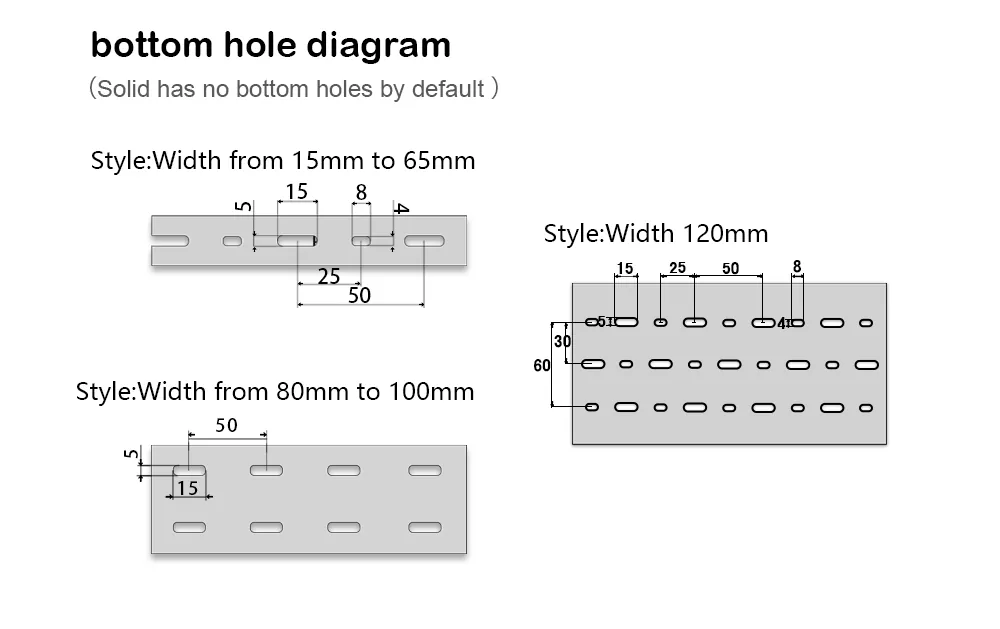 Dane techniczne korytka kablowego wyrażono jako wysokość * szerokość, przy czym jednostką jest mm. Najpierw określ wymagany rozmiar korytka kablowego, np. wysokość 80 mm i szerokość 40 mm. Następnie wybierz szerokość otworu wylotowego w oparciu o grubość okablowania, albo szerokie zęby (8 mm), albo drobne zęby (4 mm). Zaleca się, aby rzeczywisty kabel zajmował nie więcej niż 70% miejsca na korytku.
