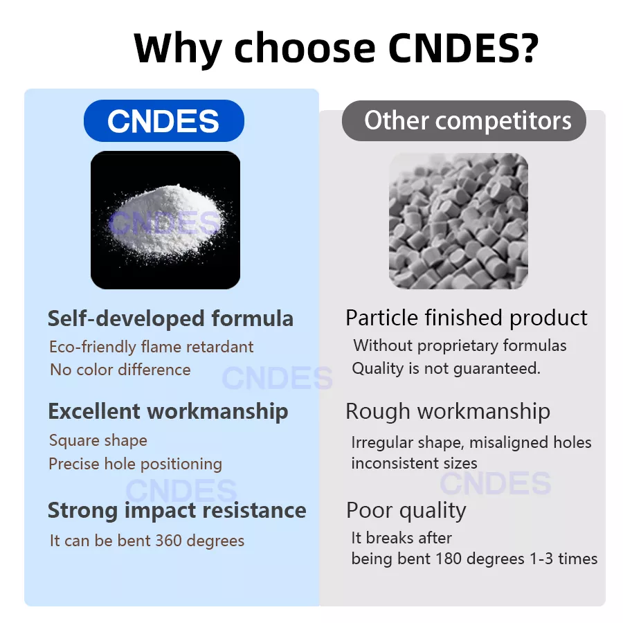 Jest produkowany z wytrzymałego, samogasnącego tworzywa sztucznego PVC, spełniającego normy ognioodporności UL94V-0 i zgodne z międzynarodowymi certyfikatami, w tym RoHS, CE, UL, REACH i ISO. Zapewnia to niski poziom dymu, brak halogenów, odporność na płomienie i wytrzymałość na wysokie temperatury (zazwyczaj praca w temperaturach od -25°C do 70°C, w przypadku wybranych modeli wytrzymujących wyższe temperatury przez krótki czas). Gładka powierzchnia bez ostrych krawędzi zapobiega uszkodzeniom kabli lub obrażeniom instalatorów, zwiększając bezpieczeństwo.